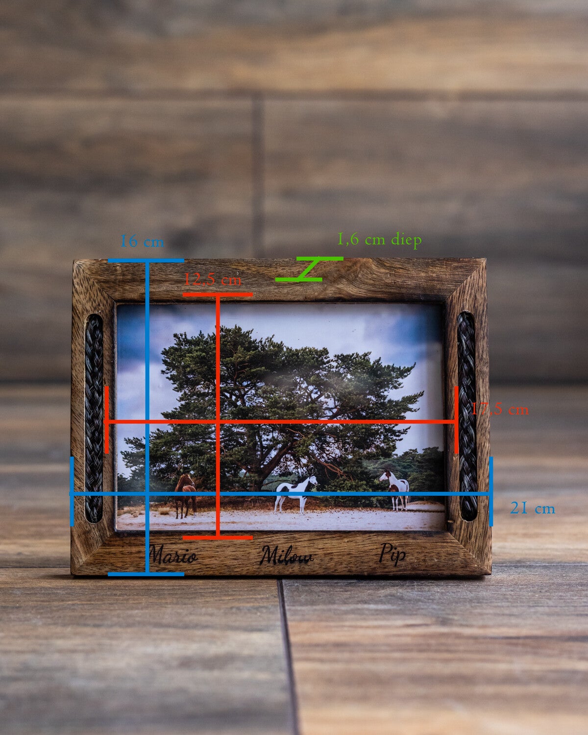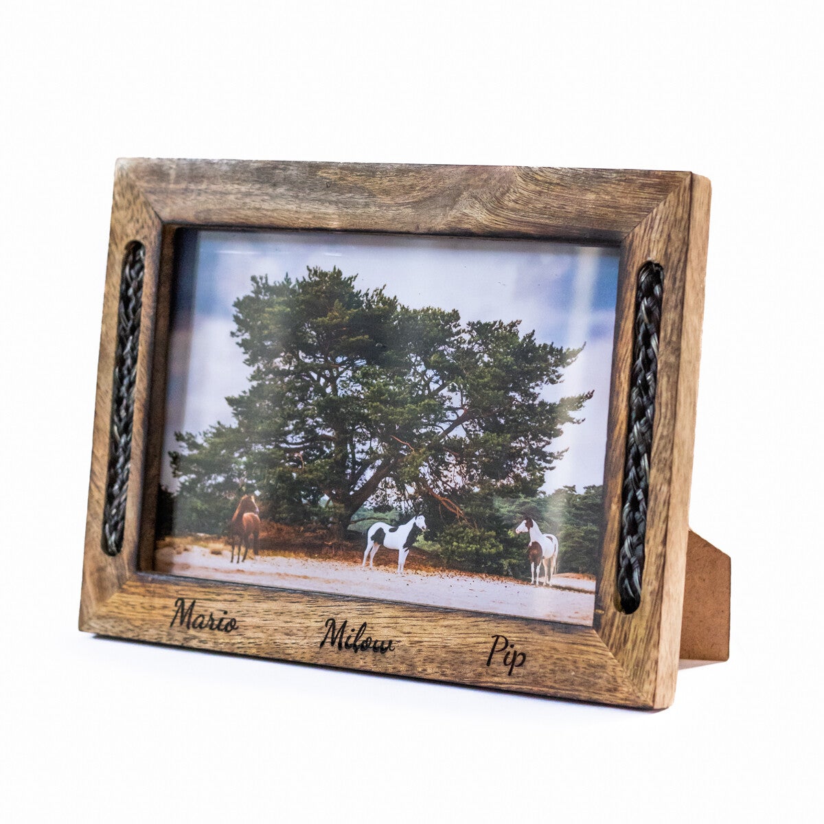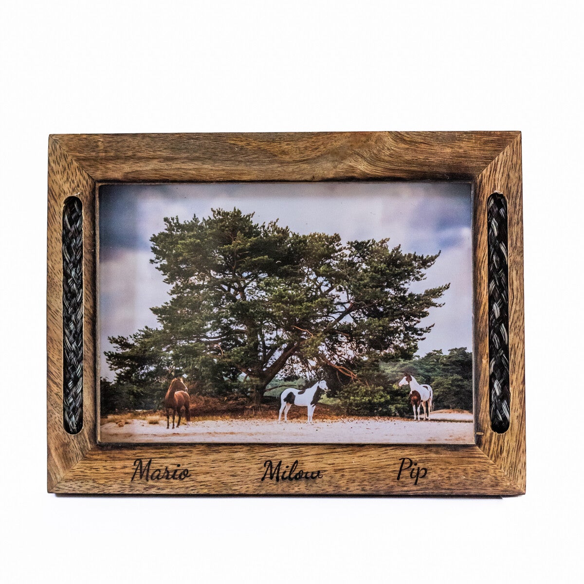 Am unteren und/oder oberen Rand des Rahmens kann eine Gravur in das Holz angebracht werden. Dabei kann es sich um einen Namen oder einen Text Ihrer Wahl handeln.